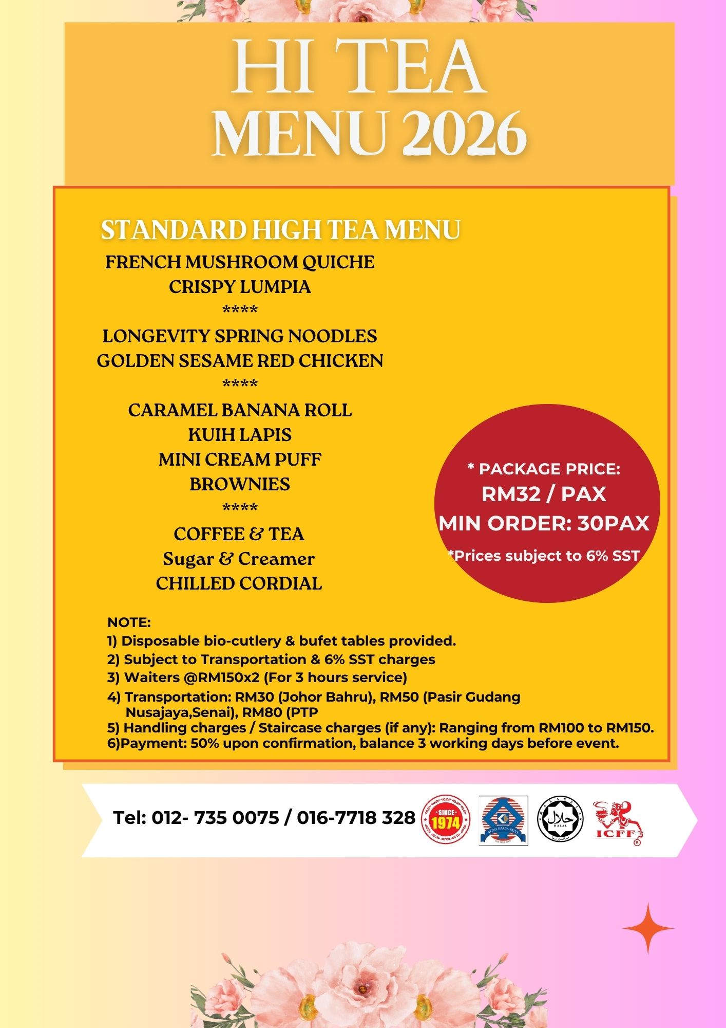 MIN ORDER: 30PAX*Subject to Transportation & 6% SST  STANDARD HI-TEA MENU FRENCH MUSHROOM QUICHE CRISPY LUMPIA LONGEVITY SPRING NOODLES GOLDEN SESAME RED CHICKEN CARAMEL BANANA ROLL KUIH LAPIS MINI CREAM PUFF BROWNIES COFFEE & TEA Sugar & Creamer CHILLED CORDIAL     Note:  ...Read more