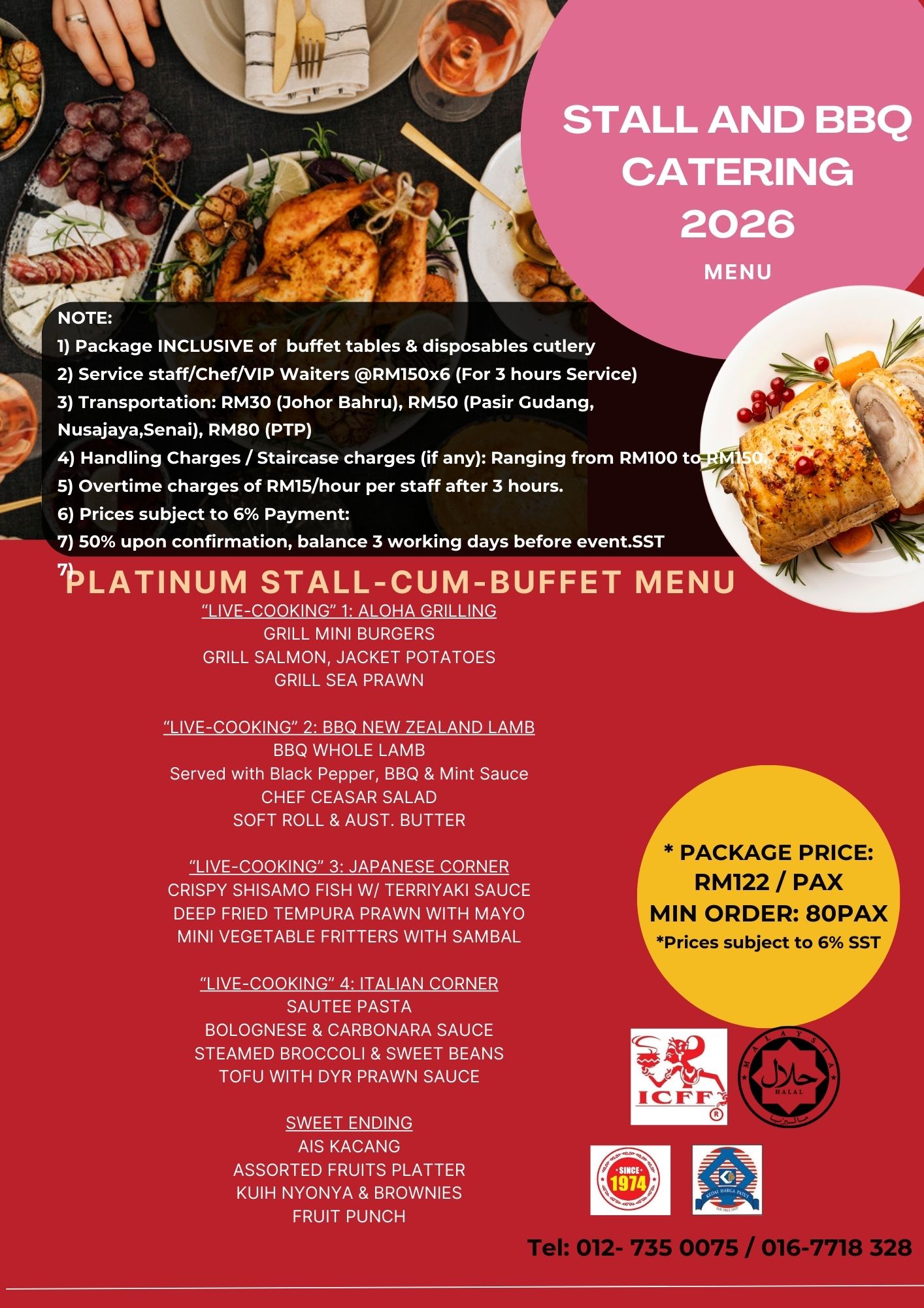 MIN ORDER: 80PAX*Subject to Transportation & 6% SST    PLATINUM STALL-CUM-BUFFET MENU   “LIVE-COOKING” 1: ALOHA GRILLING GRILL MINI BURGERS GRILL SALMON, JACKET POTATOES GRILL SEA PRAWN   “LIVE-COOKING” 2: BBQ NEW ZEALAND LAMB BBQ WHOLE LAMB Served with Black Pepper, BBQ & Mint Sa ...Read more
