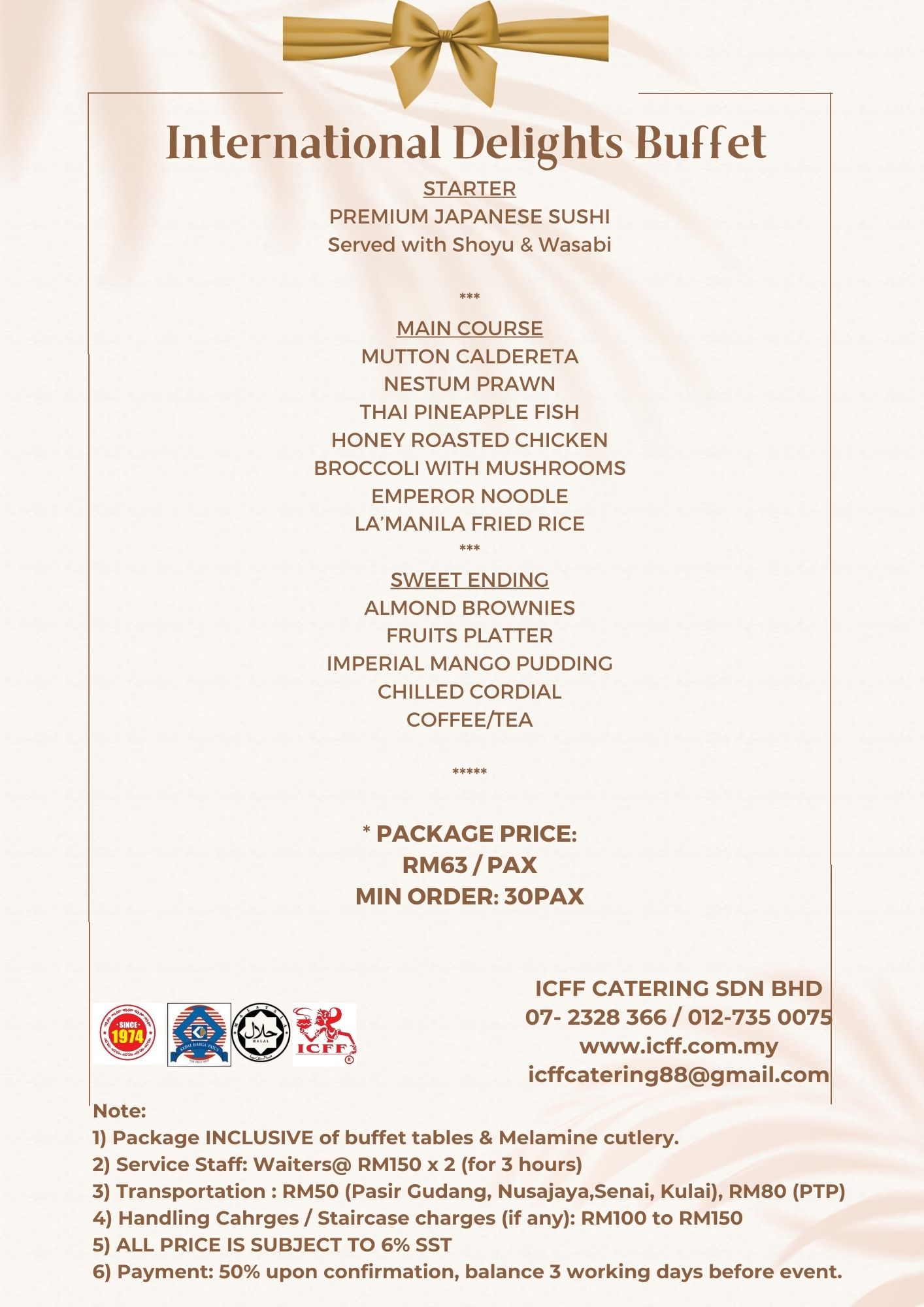 MIN ORDER: 30PAX*Subject to Transportation & 6% SST INTERNATIONAL DELIGHTS BUFFET – RM63   STARTER PREMIUM JAPANESE SUSHI Served with Shoyu & Wasabi *** MAIN COURSE MUTTON CALDERETA NESTUM PRAWN THAI PINEAPPLE FISH HONEY ROASTED CHICKEN BROCCOLI WITH MUSHROOMS EMPEROR NOODLE L ...Read more