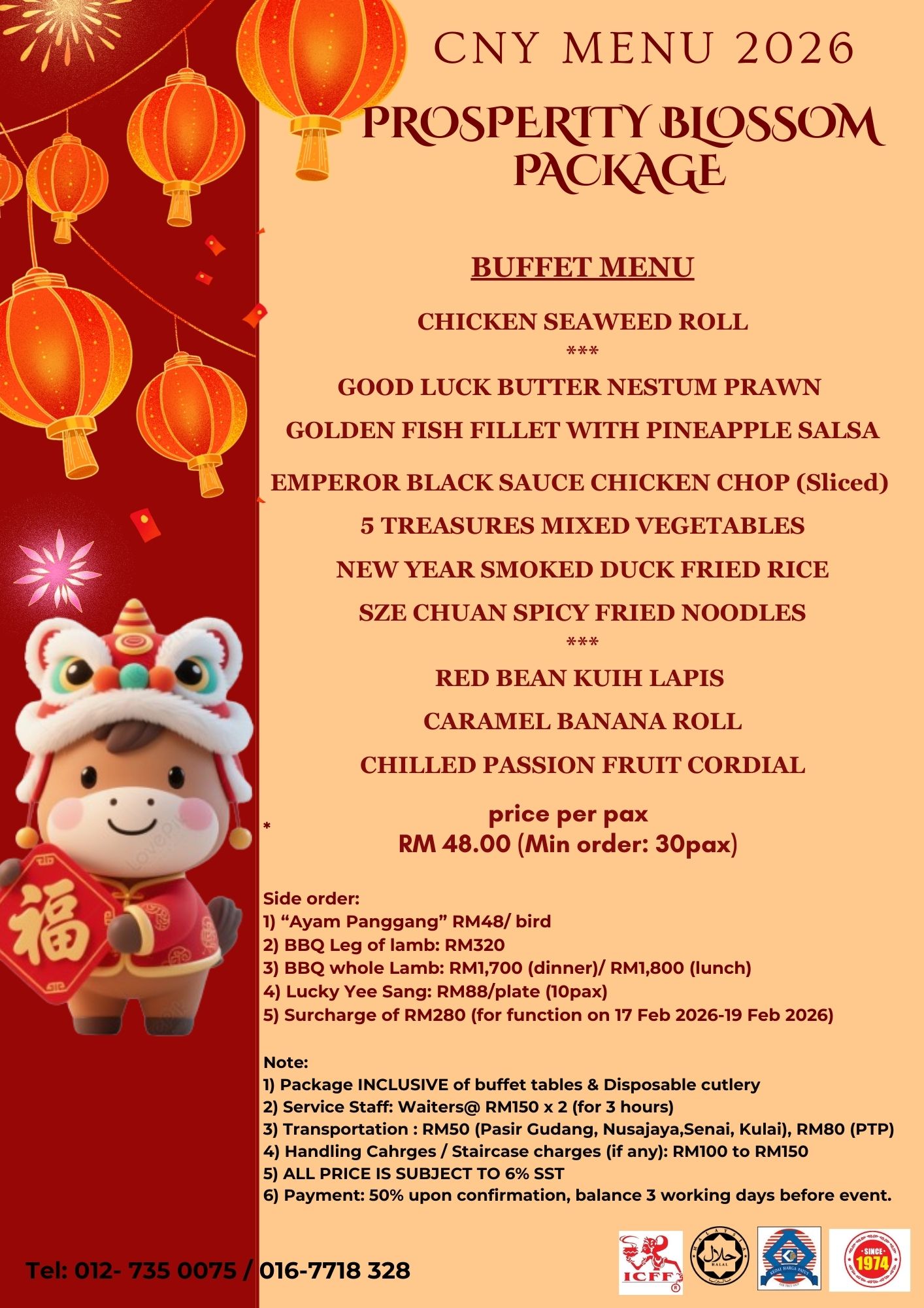 MIN ORDER: 30 Pax*Subject to Transportation & 6% SST   PROSPERITY BLOSSOM PACKAGE BUFFET CNY SQUID YOU TIAO SALAD GOOD LUCK GARLIC PRAWN WITH BUTTER CREAM GOLDEN FISH FILLET WITH PINEAPPLE SALSA FUSION RENDANG GRILLED CHICKEN CHOP (SLICED) 5 TREASURE MIXED VEGETABLES NEW YEAR SMOKED D ...Read more